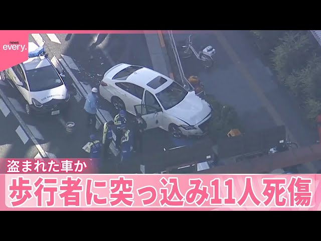 連休最終日の24日、東京・足立区で乗用車が歩行者に突っ込み11人死傷するひき逃げ事件がありました。突っ込んだ白い車は自動車販売店から盗まれた車とみられています。